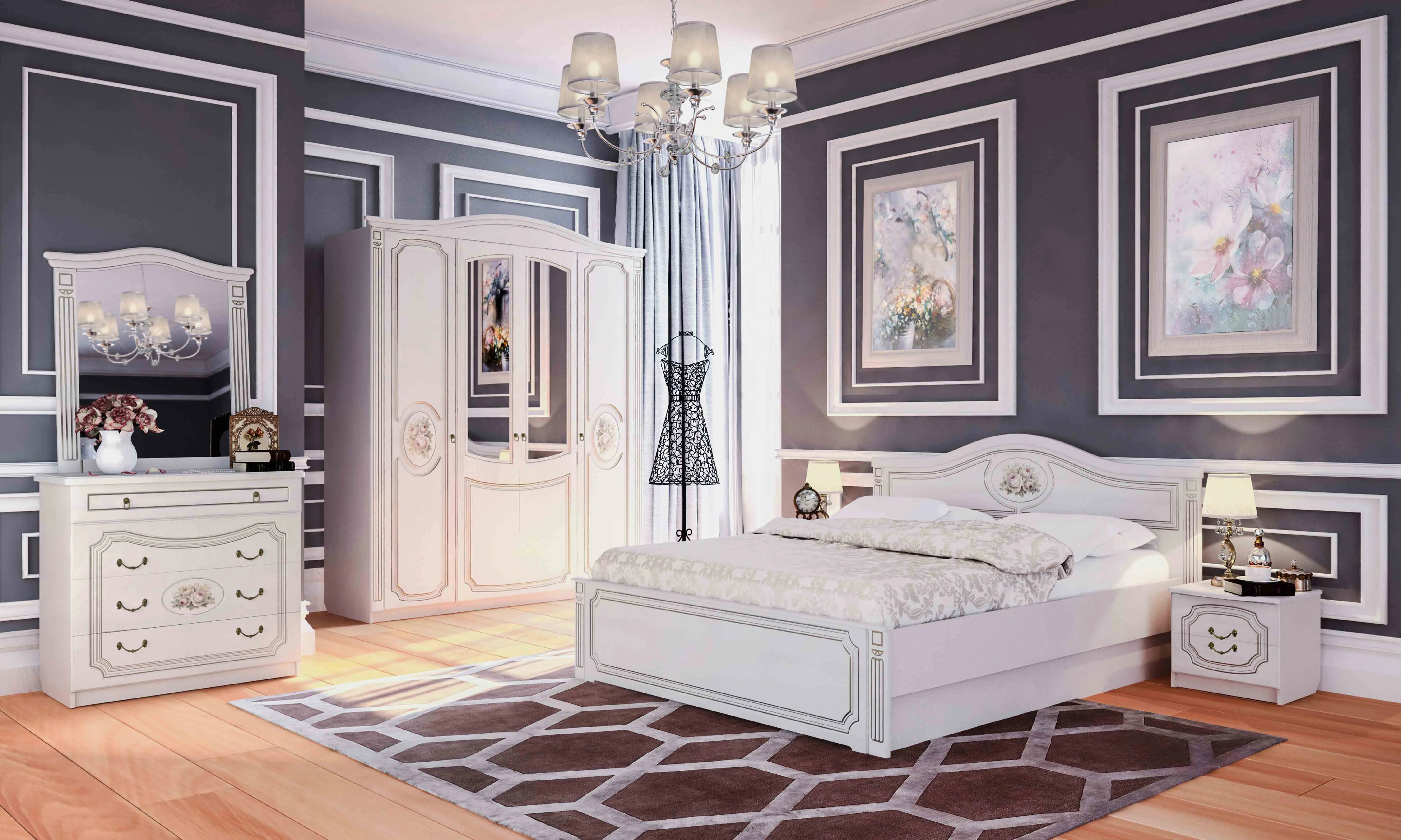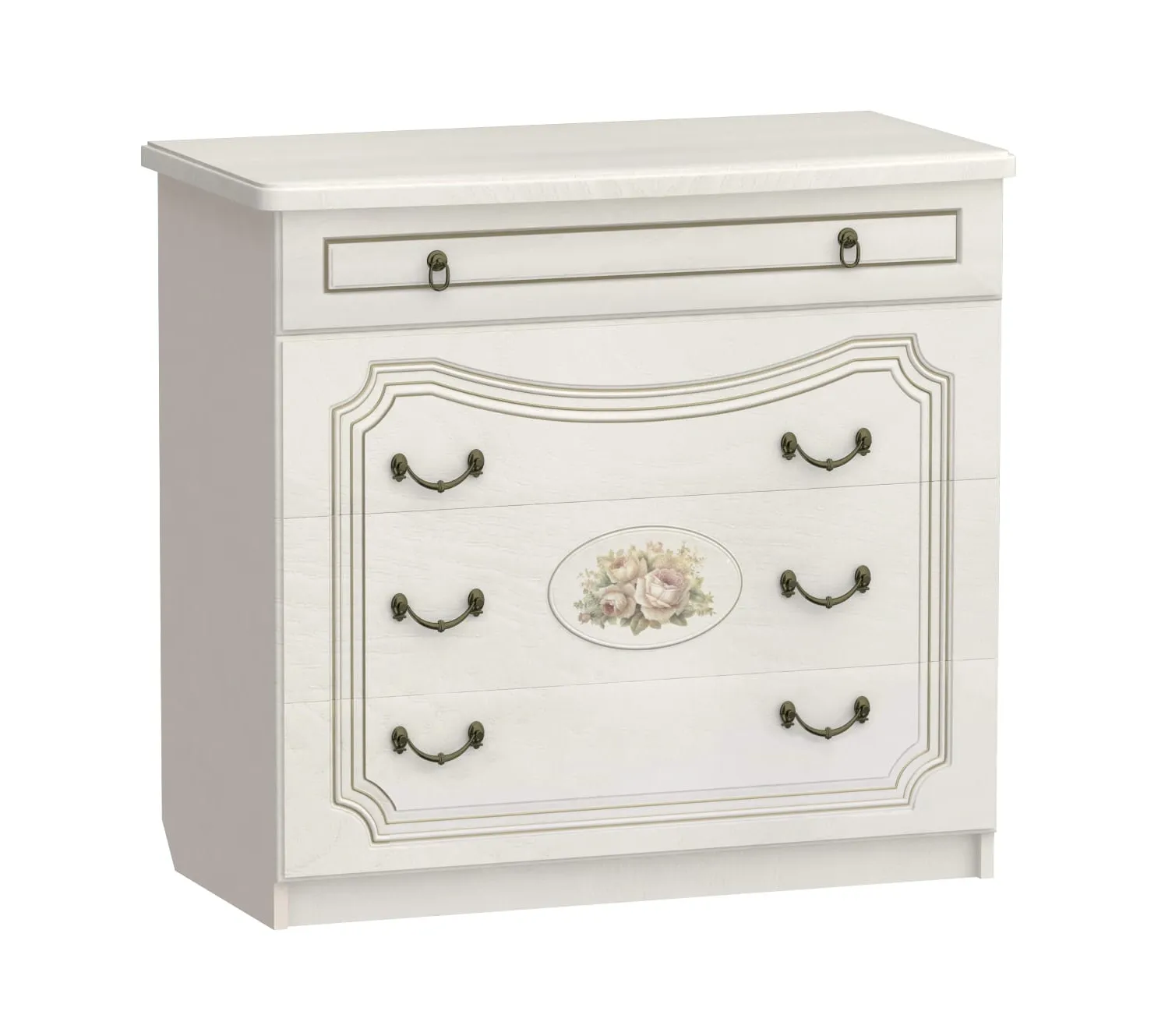 Он отличается роскошным внешним видом и наличием четырех вместительных ящиков. Фасады ящиков декорированы элегантной фрезеровкой с эффектом патины и медальоном, на котором изображены розы. Для удобства использования ящики оснащены темными металлическими ручками, имитирующими ковку.