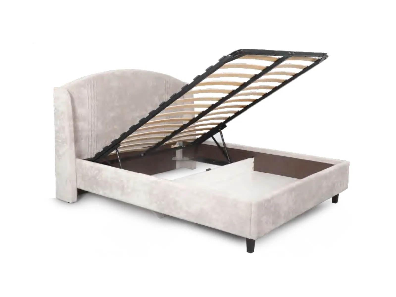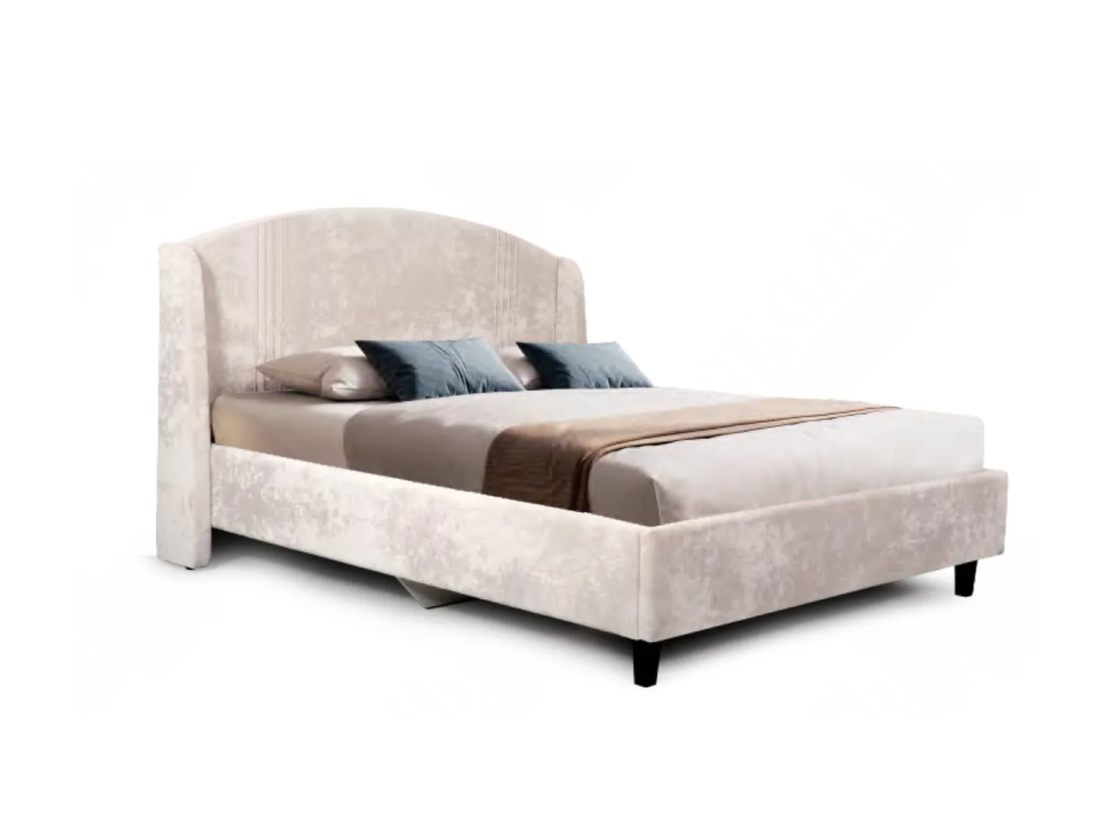 Каркас кровати обит мягким и приятным на ощупь велюром, который хорошо держит форму, устойчив к механическим воздействиям (в том числе к зацепкам от когтей животных), гипоаллергенен.