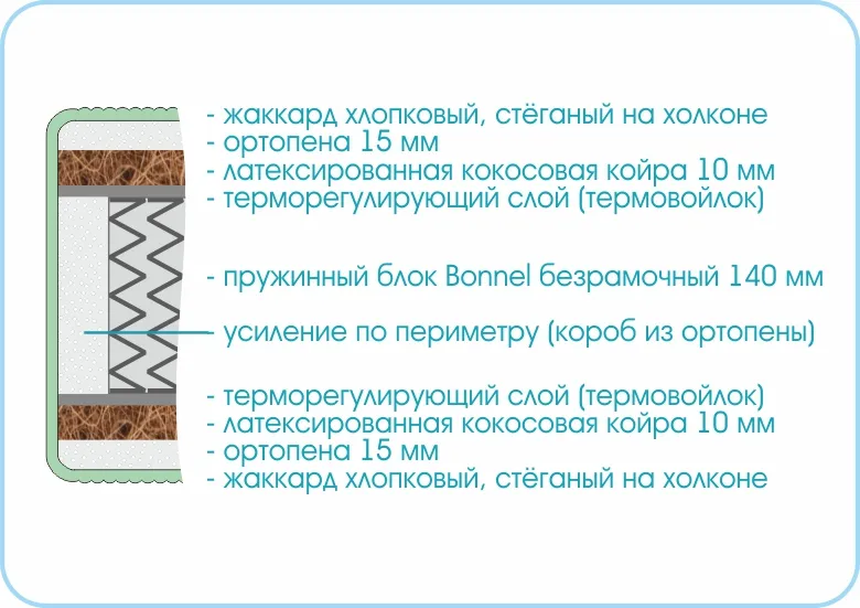 Чехол выполнен из хлопкового жаккарда, простеганного на холконе. Наполнители в сочетании с пружинным блоком создают упругость, которая обеспечивает равномерную нагрузку и комфортный сон.