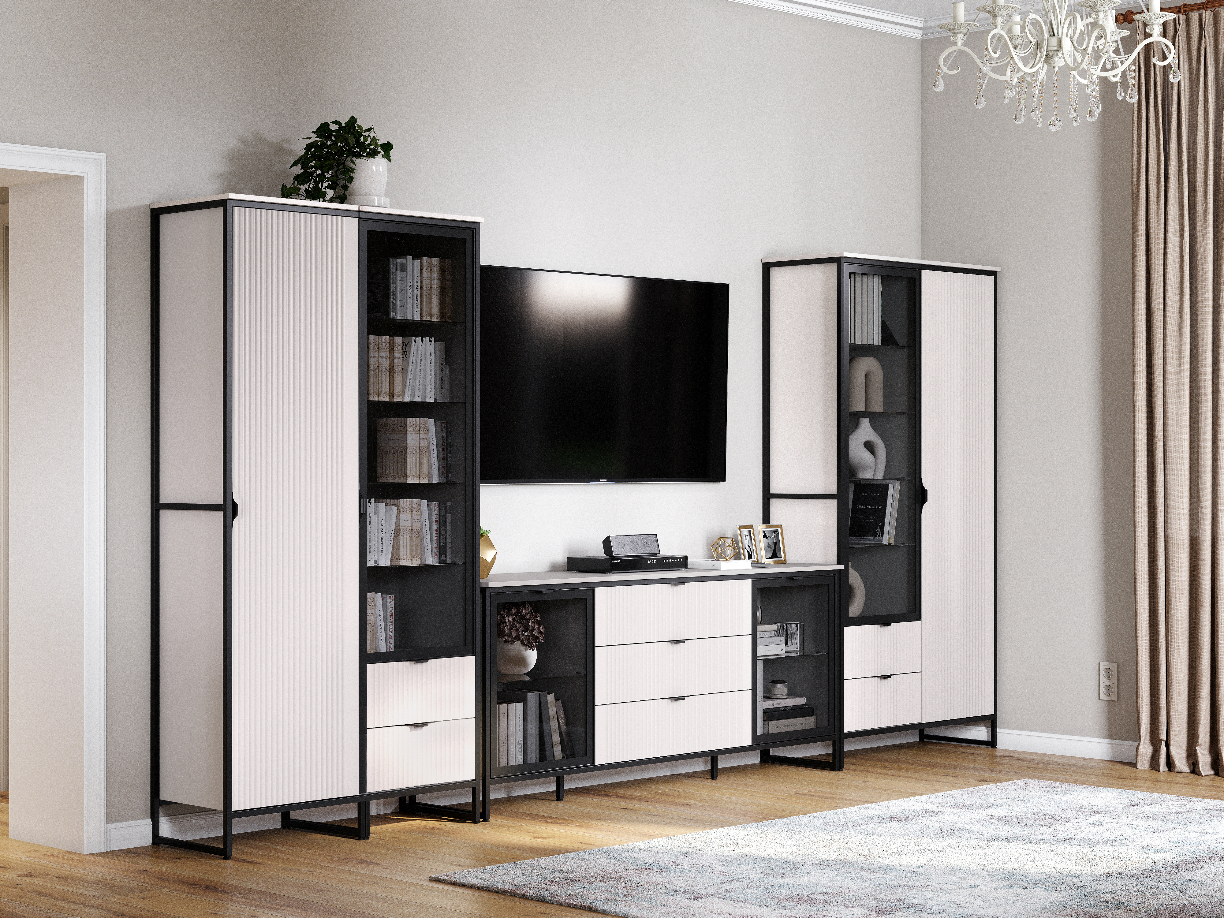 Коллекцию модульной гостиной "Нора" отличает современный оригинальный стиль. Декоративная продольная фрезеровка на фазадах из МДФ и опоры на металлокаркасе цвета соответствуют модным тенденциям этого года в ведущих зарубежных коллекциях.