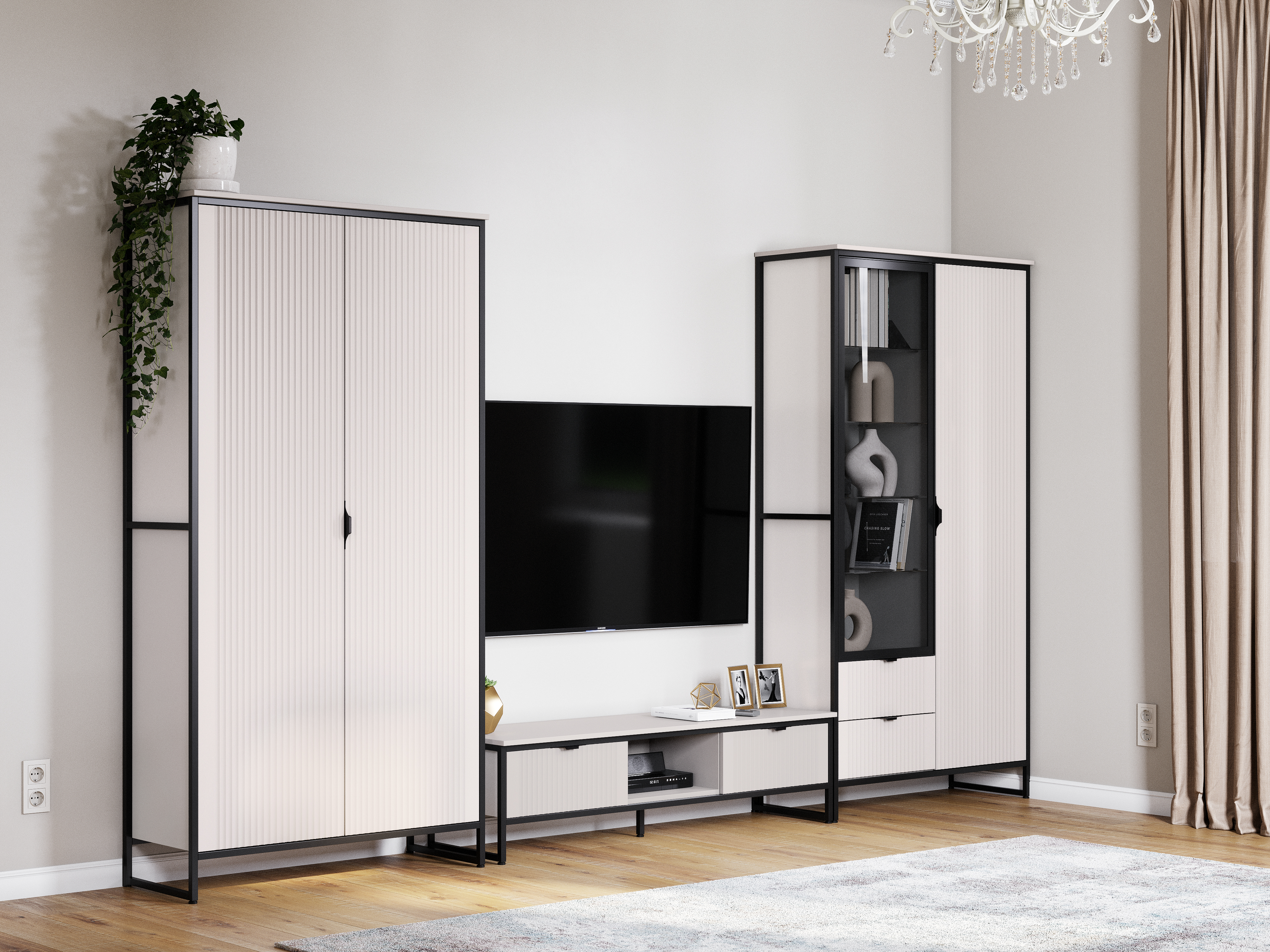 Коллекцию модульной гостиной "Нора" отличает современный оригинальный стиль. Декоративная продольная фрезеровка на фазадах из МДФ и опоры на металлокаркасе соответствуют модным тенденциям этого года в ведущих зарубежных коллекциях.