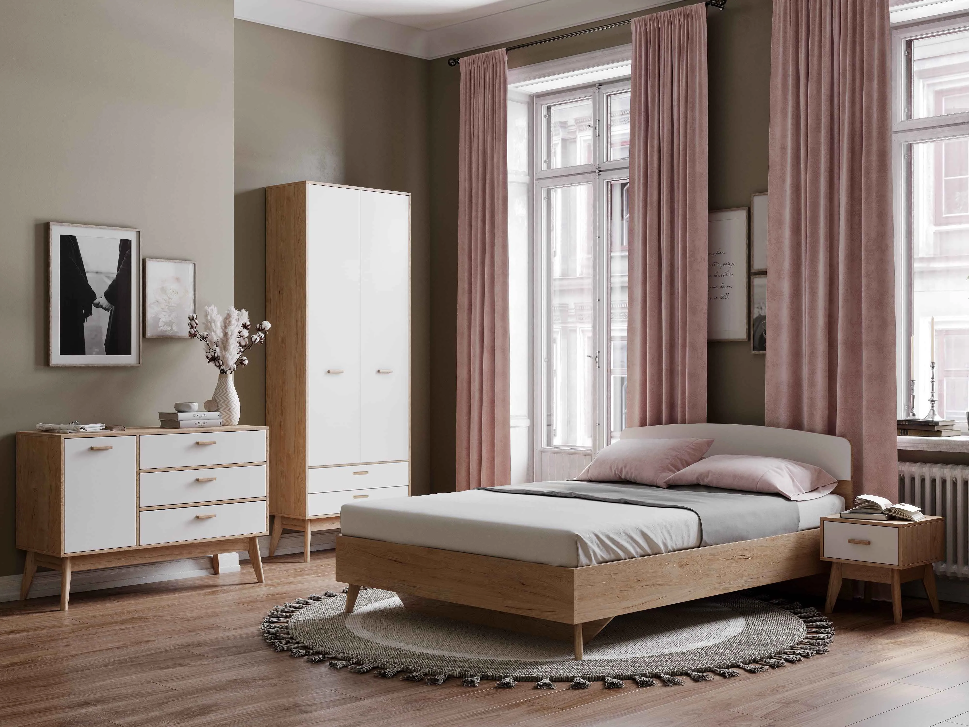 Несмотря на свои габариты и отличную функциональность, шкаф выглядит очень легким и нарядным в интерьере спальни, высокие стильные опоры из массива березы обеспечивают пространство под шкафом, удобное как для легкой уборки, так и для дополнительного хранения вещей в стильных коробках. Распахнув шкаф, вы обнаружите просторную секцию с горизонтальной штангой для одежды на плечиках, внизу шкафа расположены два вместительных выдвижных ящика для хранения различных вещей и предметов.