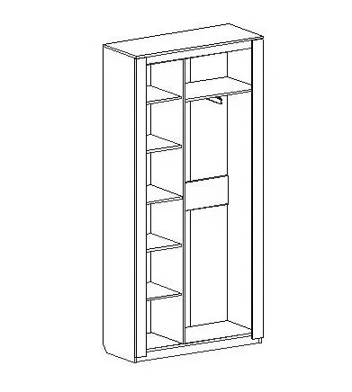 Двухдверный шкаф "Элана" с распашными дверцами имеет два отделения: отделение для белья с четырьмя съёмными и центральной стационарной полкой; платяное отделение со стационарной полкой и выдвижной стальной штангой.