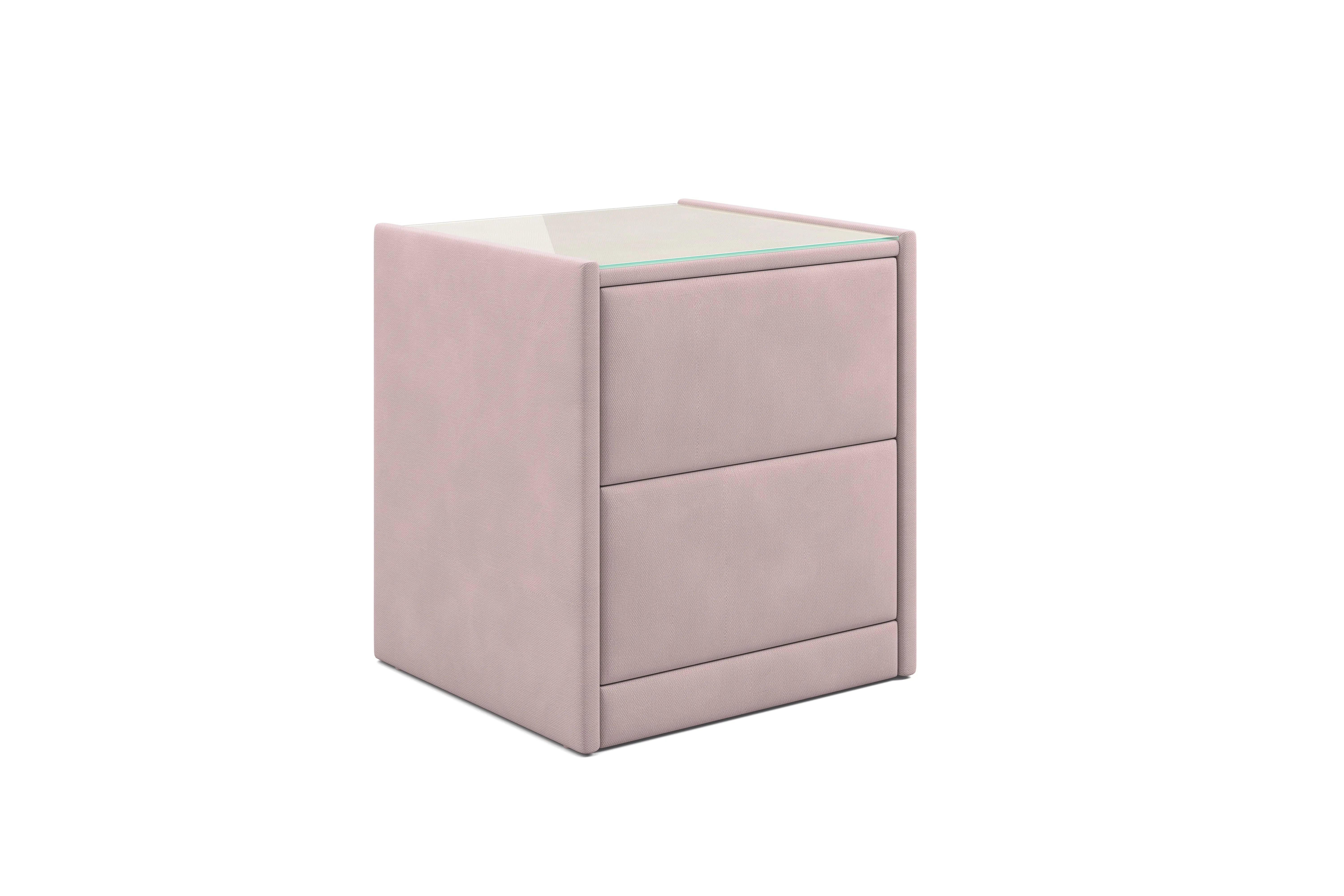 Тумба обтянута высококачественным велюром, что придает ей особый уют и комфорт. Имеет стеклянную столешницу и два вместительных выдвижных ящика с механизмом Push to open. Скругленные торцы модели, минимизируют риск удариться в темноте.