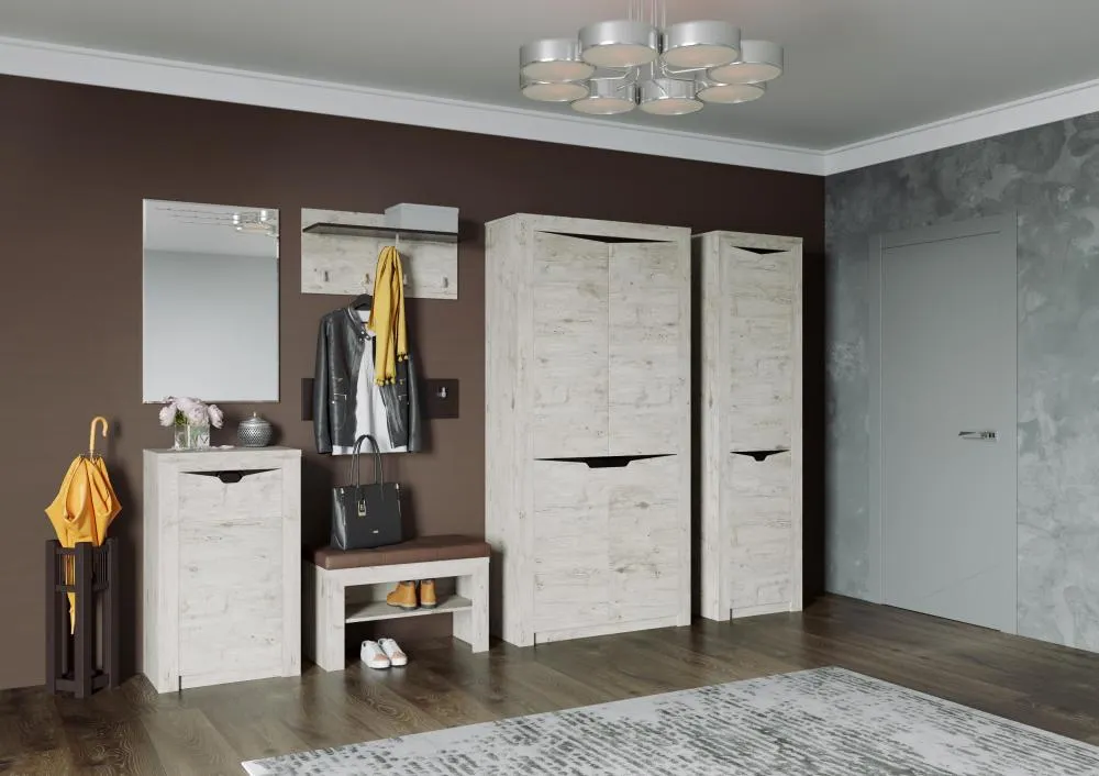Тумба имеет распашную дверцу, за которой скрывается достаточно места для хранения обуви, а выдвижной ящик идеально подходит для хранения мелких предметов, таких как ключи, перчатки и шапки. Для открывания двери внутри устанавливается система Push to open открывающая ее после нажатия. На открытой полке можно разместить аксессуары или декор, чтобы добавить индивидуальности прихожей.